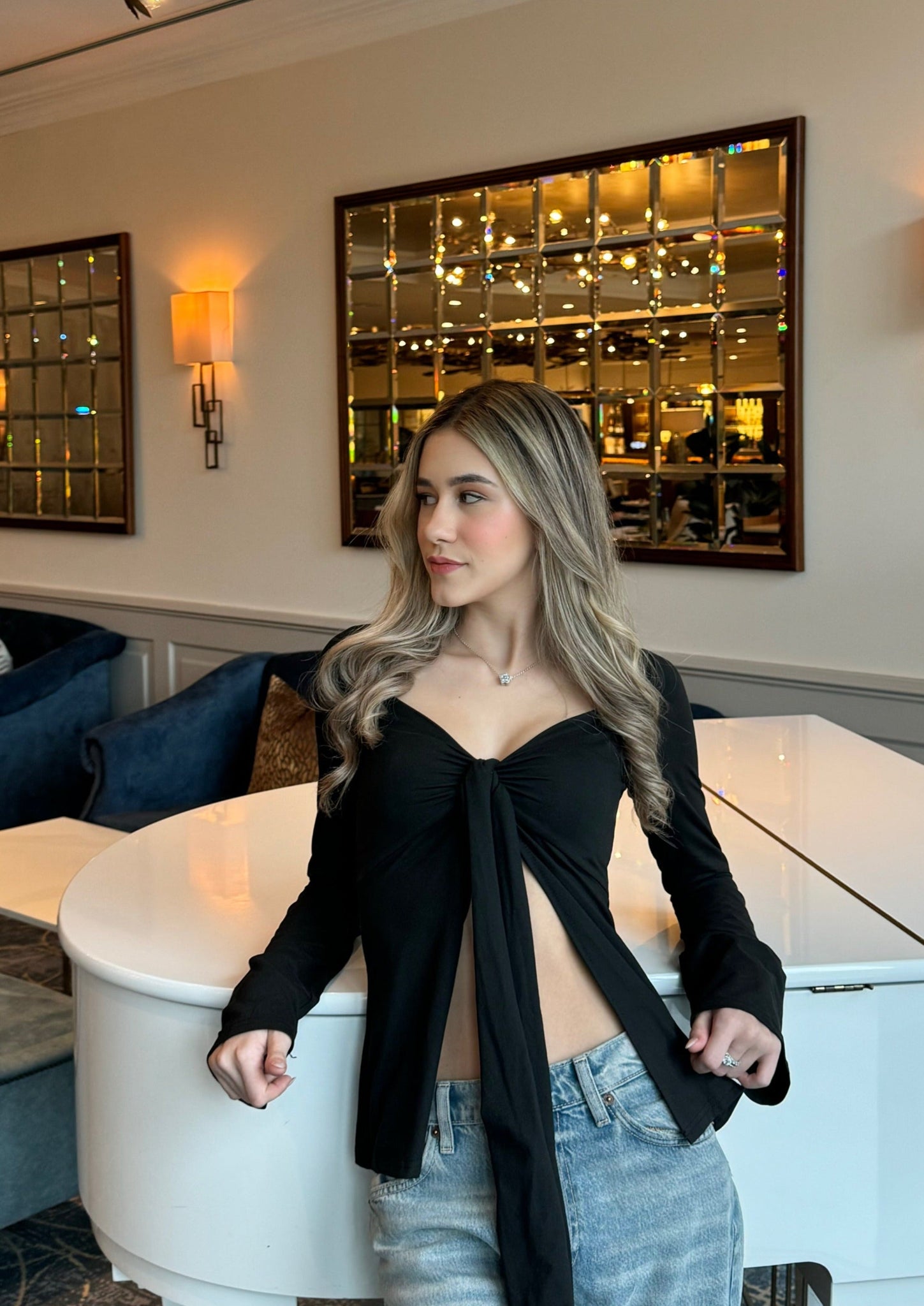 Estella Tie Front Long Sleeve Top - Black